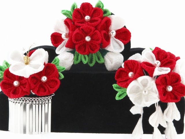 こども髪飾り’鈴音屋’手作り-ちりめん髪飾り 紅白摘み藤に白の蝶 銀ビラ付き 3点セットSZN 738