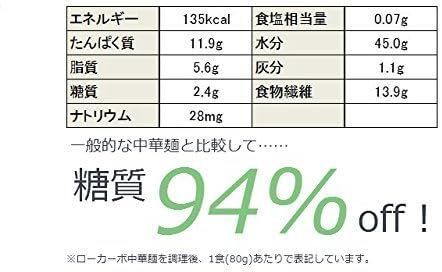 〇たった糖質2.4gの超低糖質な本格大豆麺です。 一般的な中華麺(※)に比べて【およそ94%オフの糖質2.4g】の糖質オフ麺です。 大豆を主原料としているため、低糖質なだけではなく食物繊維や大豆イソフラボンなども摂取できるバランス栄養食品です。 具材やタレなどを工夫すれば、1食あたりの糖質を10g以下に抑えることも可能です。 ※一般的な中華麺=100gあたり糖質50g想定
