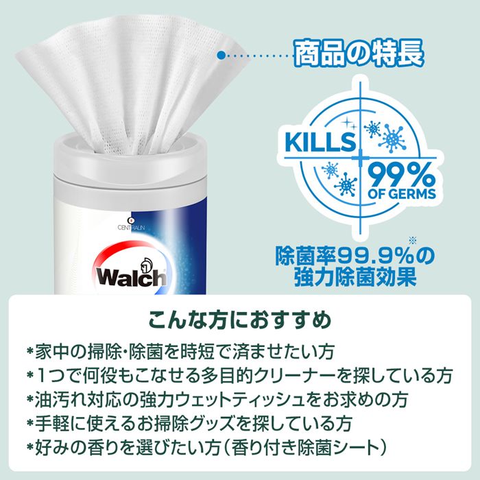 「Walch(ウォルシュ)」の除菌シートは、99.9%除菌※1の強力な除菌力に加え、キッチンの油汚れや生活汚れも簡単に拭き取れる高性能ウェットティッシュ。