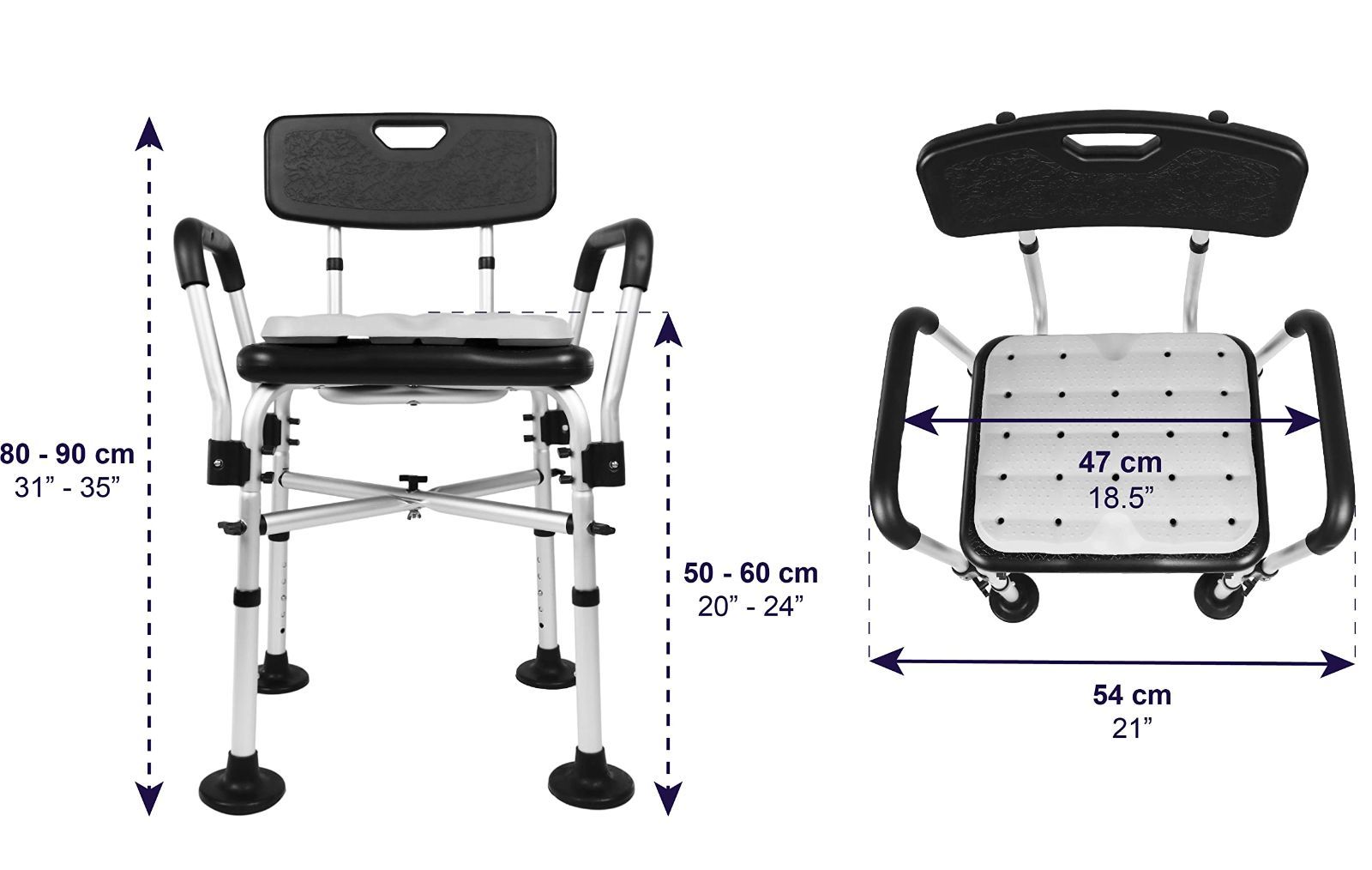 安定かつ安全:このシャワー椅子は入浴時のサポートと快適さを提供するように設計されています。滑り止めチップが付いており、ユーザーの安全性と安定性を確保します。アルミニウム製シャーシにより腐食の心配がありません。
