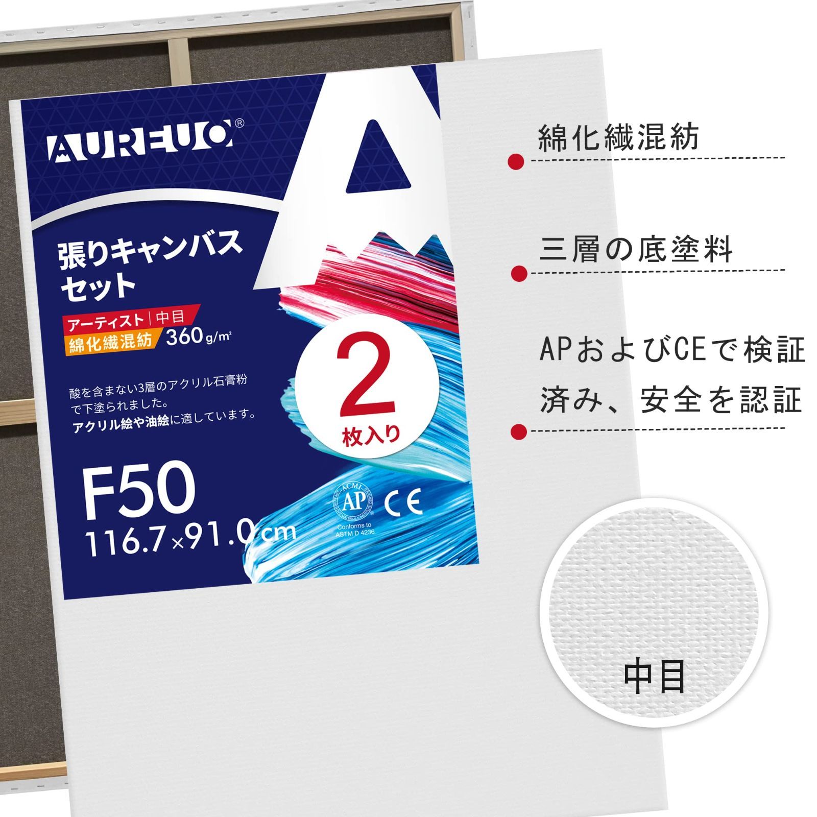 AUREUO 張りキャンバス セット F50 (116.7cmX91cm) 中目 綿化繊混紡 2枚 初心者 絵画用具 芸術絵創作 現代油絵 美術装飾 水彩画・油絵画・アクリル兼用