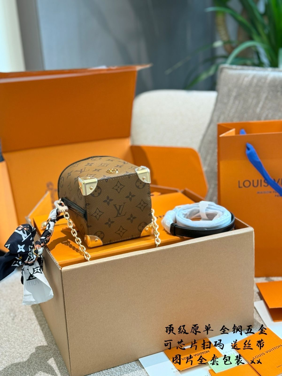 素材には輸入元廠生地を使用し、A 級全鋼ハードウェアが耐久性と高級感を兼ね備えています。サイズ 11.5×11.5×11.5cm のボックス型デザインは、小銭入れ・カードケース・化粧品などをスッキリ収納でき、カジュアルな日常からナイトアウトまで幅広く活躍します。