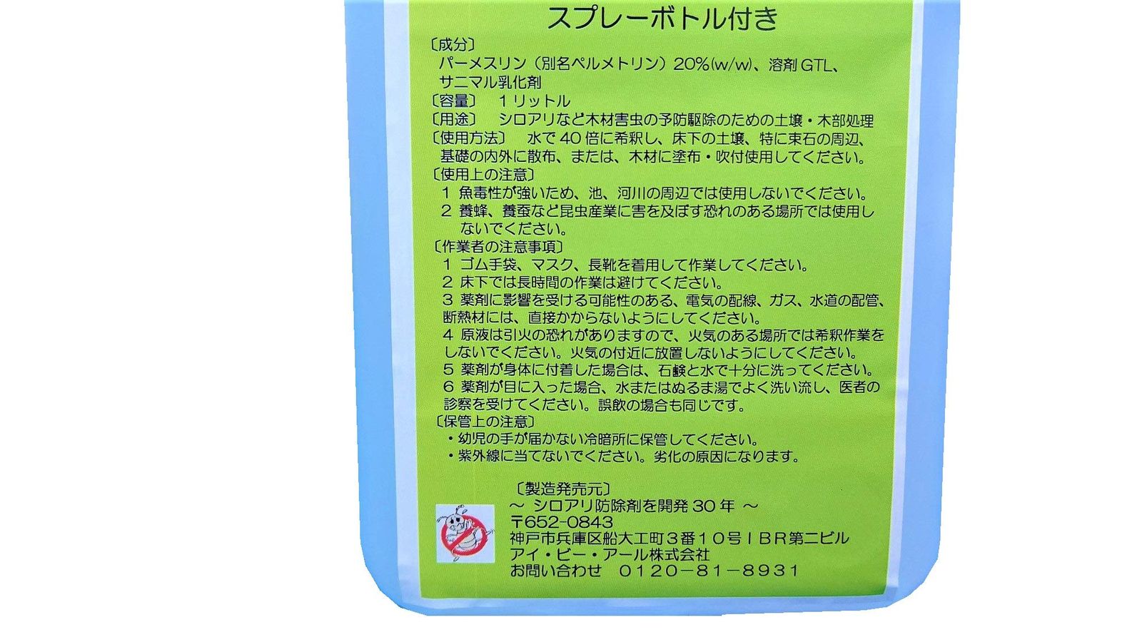 安全な殺虫成分: ピレスロイド系殺虫成分ペルメトリンを主成分とする、人体・ペットに安全なシロアリ駆除剤です。
