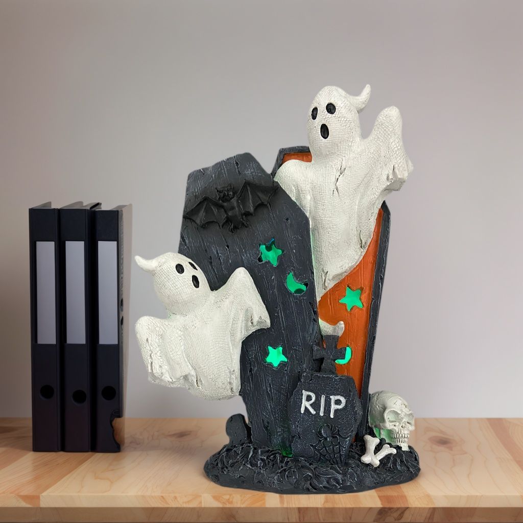 かわいらしい2体のオバケがデザインされたハロウィン装飾ナイトライトです!おしゃれでかわいいこの卓上ライトは、寝室やリビングにぴったりの間接照明として、快適な雰囲気を演出します。樹脂製で軽量かつ耐久性に優れており、電池式なので取り扱いも簡単。ハロウィンや特別なイベントに彩りを加え、もちろんギフトやプレゼントにも最適です!お子様の授乳ライトとしても安心して使用できるアイテムです。