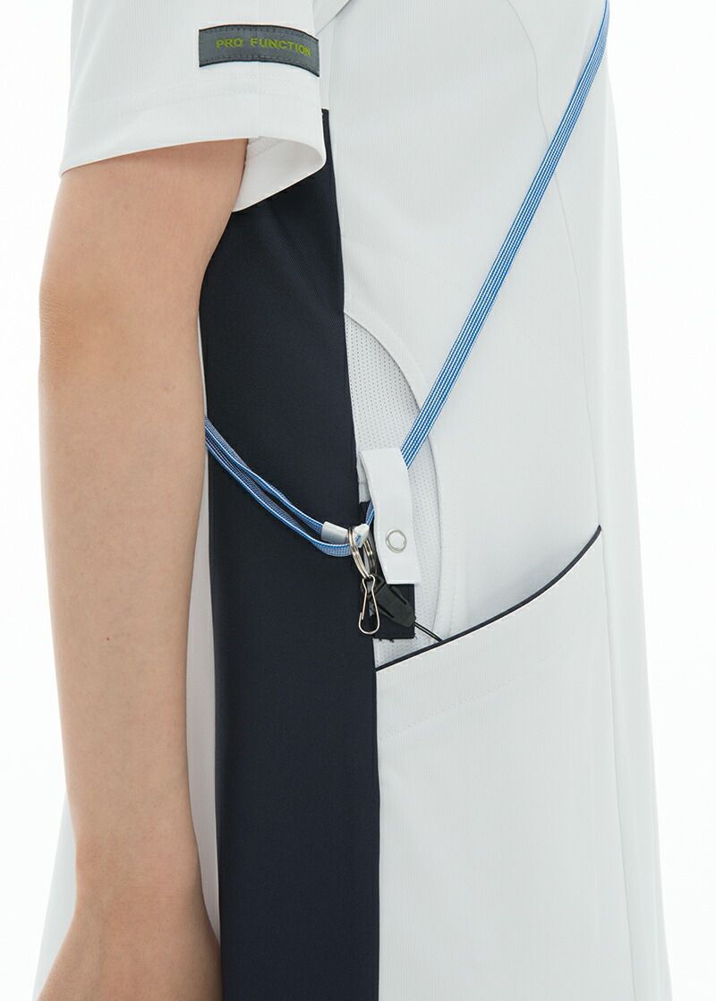 優れたストレッチ性と衣服内の適温性を備えた素材を使用し、デザイン面では白衣とスクラブの融合型をベ-スに腕の可動範囲を広げる脇のカットや、通気性をさらにUPさせるメッシュ仕様になっています。右脇ループは鍵やストラップコードなどを掛けられるWループ仕様になっています。